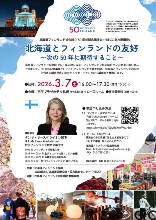 祝賀事業のスタートとして、駐日フィンランド共和国タンヤ・ヤースケライネン大使をお迎えし、記念講演会「北海道とフィンランドの友好~次の50年に期待すること~」を3月7日(土)に開催します(HIECC北方圏講座)。