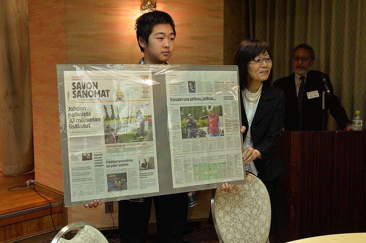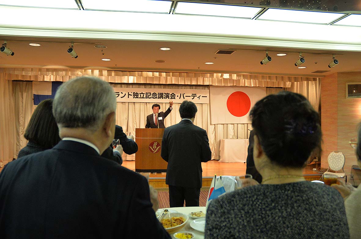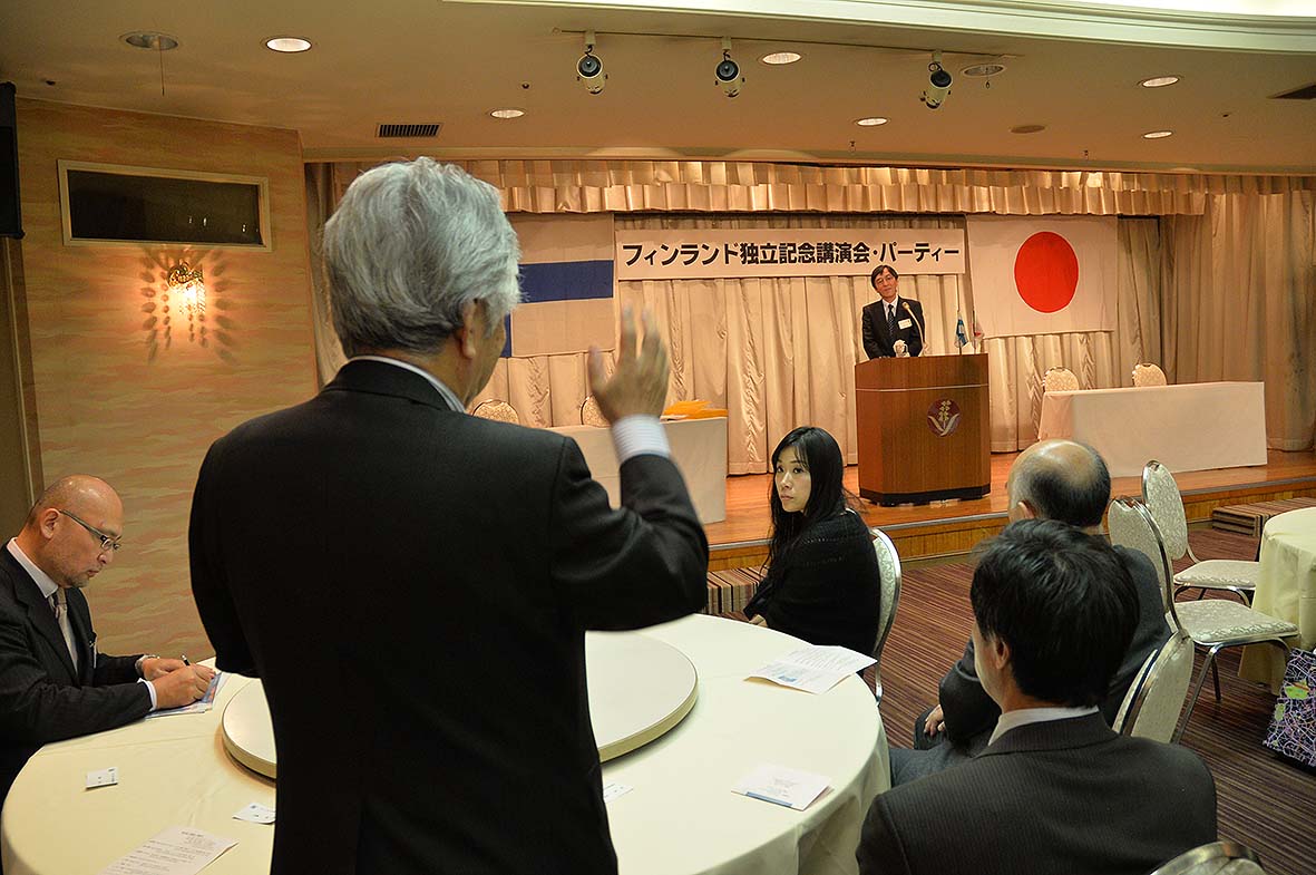 会場はKKR札幌。第1部の講演会司会を白澤常務が担当。長谷川名寄フィンランド協会会長の開会挨拶で始まり。「不屈の翼・カミカゼ葛西紀明のジャンプ人生」の筆者岡崎敏氏にご講演を頂きました。岡崎氏は普段知ることのできない葛西選手の素顔や裏話などをご紹介して頂き楽しい講演会でした。会場の皆様も面白いエピソードの興味津々のご様子。質問もたくさん頂き、安養顧問の挨拶で第1部は終了しました。第2部は、同じ会場で柴田常務・横山和美理事の司会で行われる、クリスマスを兼ねた独立記念パーティー。この中では、佐藤理事のカンテレによる「フィンランド国歌演奏」。名誉領事・横山清様の開会の挨拶。髙橋北海道国際交流センター副会長と元参議院議員中川義雄様の来賓ご挨拶。井口会長の乾杯で始まりました。料理や飲み物が運ばれパーティのスタートです。留学生のエリッキ君やカンテレあんざんぶる”みゅう”の演奏や、フィンランドからの留学生の自己紹介、スピーチタイムの後、恒例の「持ち寄りオークション」が行われ、多額の落札金額で会場は盛り上がりました。これは今後の協会の運営に役立てさせて頂きます。予定時間を大きくオーバーし協会副会長の柴田北洋銀行副頭取の乾杯で楽しかったパーティもお開きとなりました。Merry Christmas !