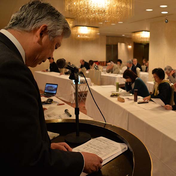 司会の阿部専務理事の進行で、井口会長のあいさつに続き、HIECC髙橋副会長の来賓ご挨拶をいただき議事に入りました。渡邊専務理事の2013年事業報告と決算報告。阿部専務理事の2014予算案の承認を得。ご来賓の林万里東川町教育長さまから、「フィンランド教育研究会 in 東川」のご案内を頂きました。